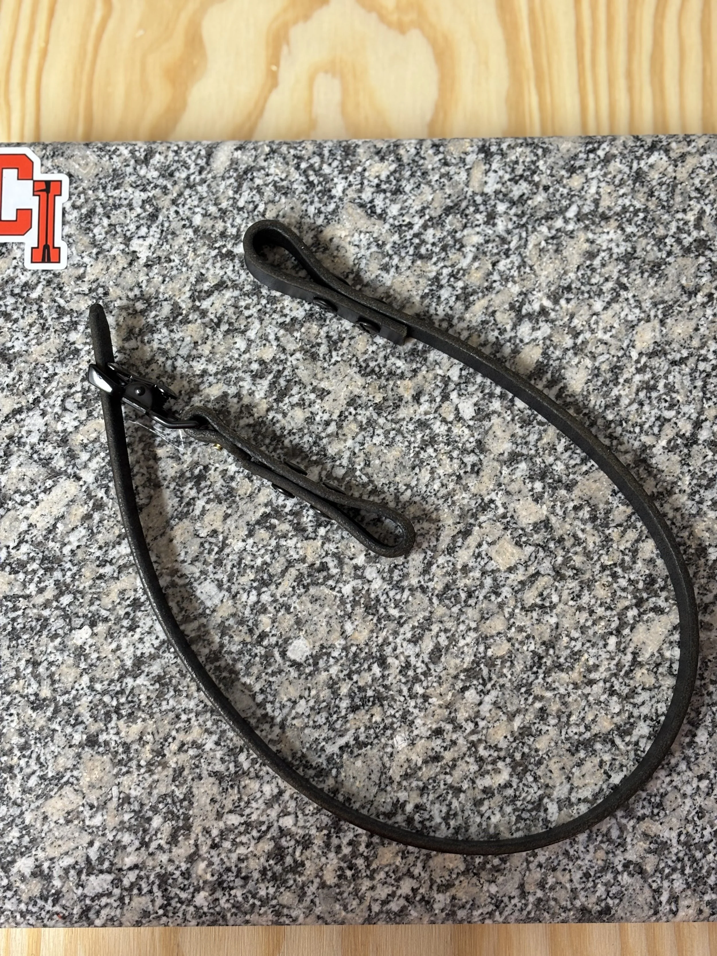Our leather chinstraps are made from leather sourced from the Midwest. They are hand-cut and hand-built to a length of approximately 32”. These are standard, with no customization, and are in-stock ready to ship!